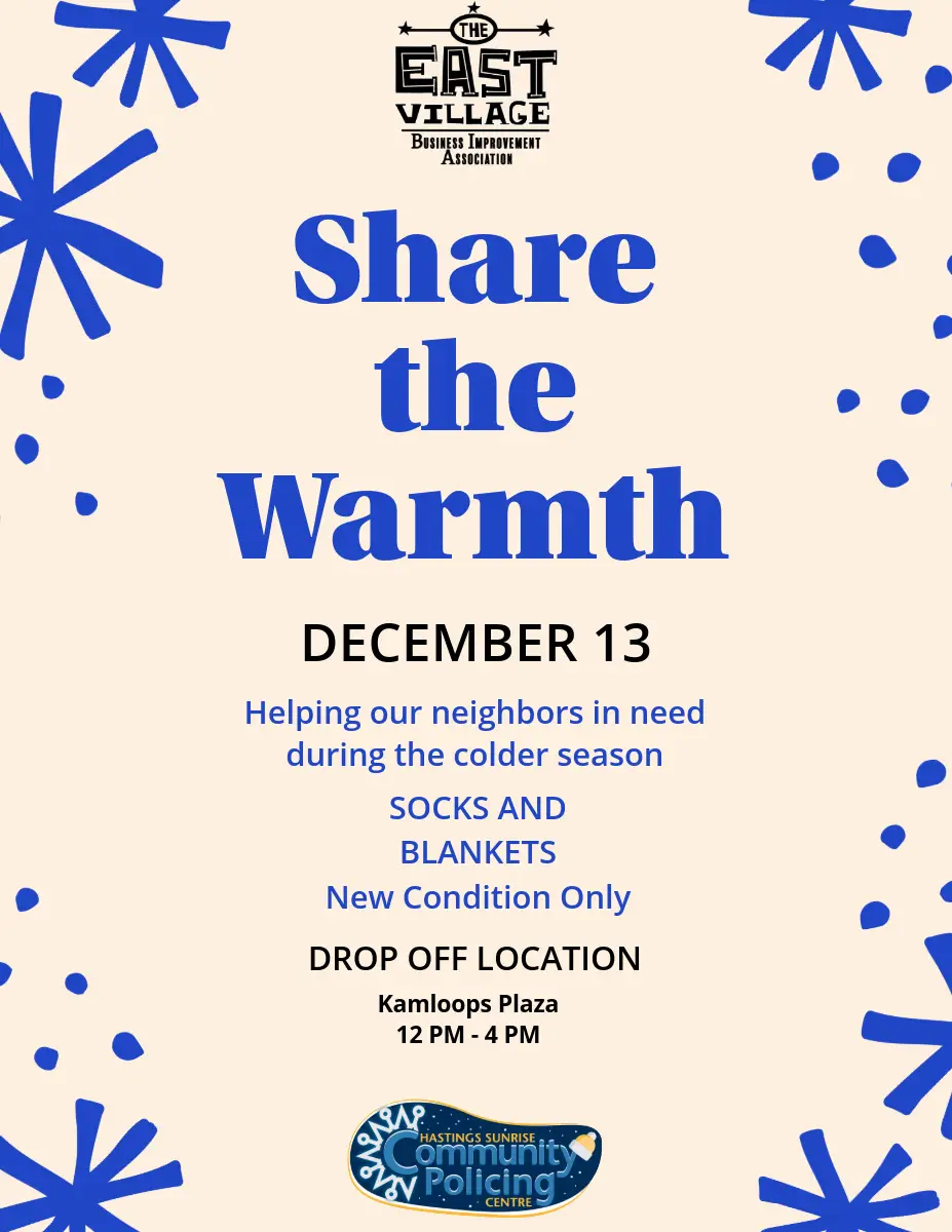 We have aslo partner up with the Hastings Sunrise Community Policing Centre to collect NEW warm socks and blankets to hand out to folks who need them this season. We will be accpeting NEW socks and blanket donations at the event!